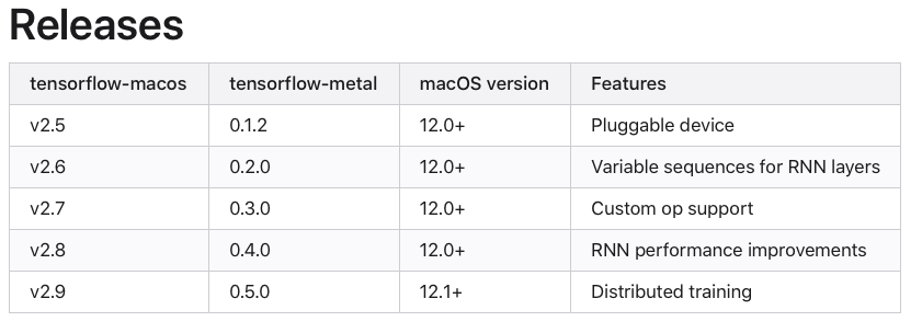 tensorflow-metal의 경우 0.7.1 이 최신버전이지만 공식홈페이지에서 지원하는 최신버전이 0.5.X 버전이다.