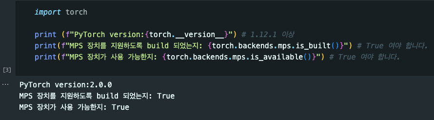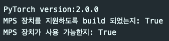 print(f"MPS 장치가 사용 가능한지: {torch.backends.mps.is_available()}") # True 여야 합니다.