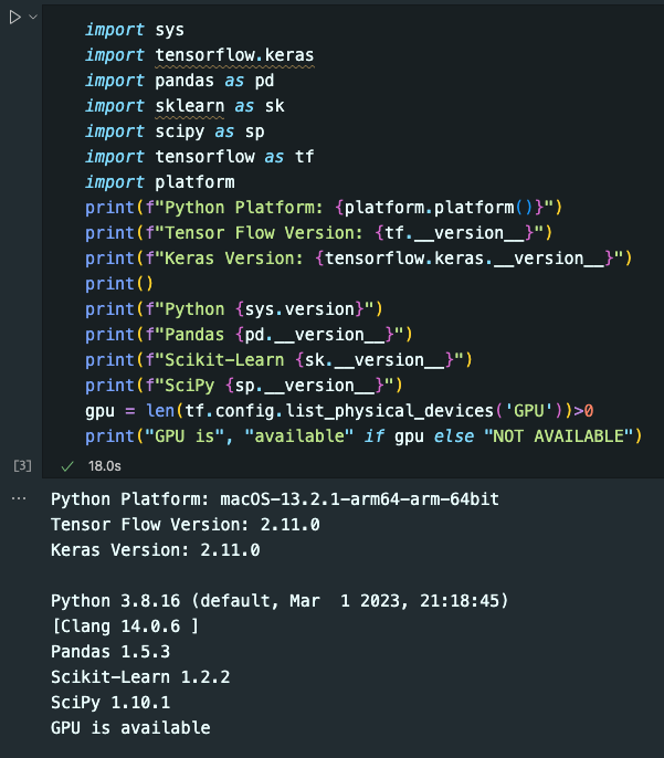 설치가 잘 되었는지를 확인하기 위한 코드를 VSCODE나 주피터노트북을 실행해서 작동시켜보면 다음과 같이 나와야한다.