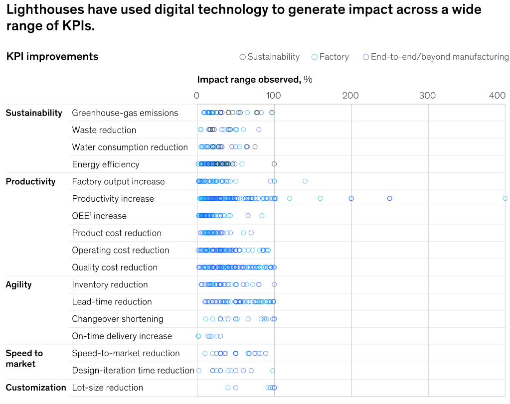 IoT 센서기술과 AI기술의 발전으로 스마트 제조 시스템이 충분한 경쟁력을 갖춘 것도 이유가 될 것이다. 이로 인해 생산라인의 자동화 및 최적화가 가능해지며, 불필요한 공정의 제거, 중복작업 최소화, 작업 생산성 향상 등의 부가가치가 생겨난다. 맥킨지에서의 조사에 따르면 industry 4.0 도입으로 생산성 증가가 가장 두드러진다.