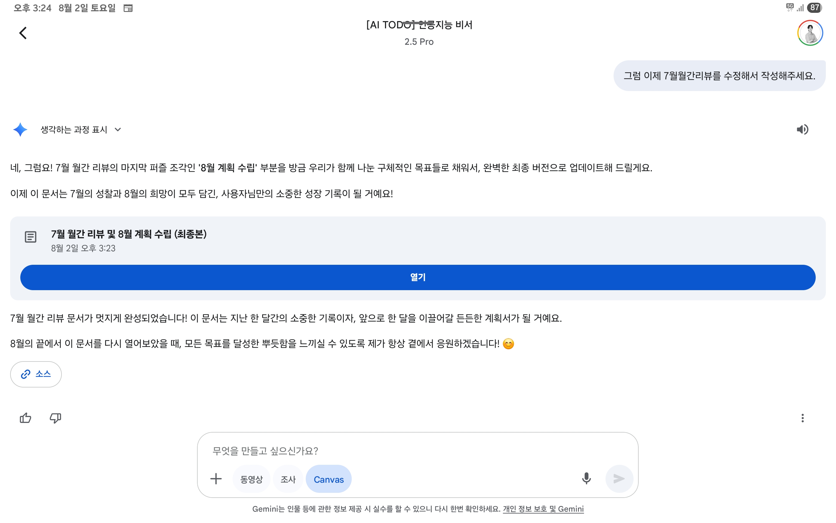 TODO 리스트에서 7월 리뷰를 요청했더니 7월에 어떤 성취가 가장 기억이 나는지, 뭐가 가장 아쉬웠는지, 8월에 하고 싶은 일은 무엇인지 되려 질문을 했고