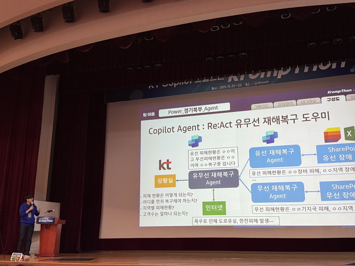 결국 10분간 무대에 올라가서는 꾸밈없이 진솔한 이야기를 했다. 가평에서 밤새 자료를 만들고 복구 계획을 세우며 힘들었던 이야기, 자연재해가 닥쳤을 때 어디서부터 복구해야 할지 막막했던 경험들을 현장의 관점에서 전달했고 그런 마음으로 만든 Agent를 있는 그대로 발표했다. 사실 이 대회의 취지는 MS의 Copilot Agent를 얼마나 잘 고도화하느냐였는데, 그저 업에서 있었던 내 이야기를 하고 내려왔다.