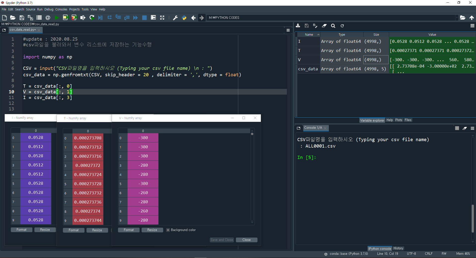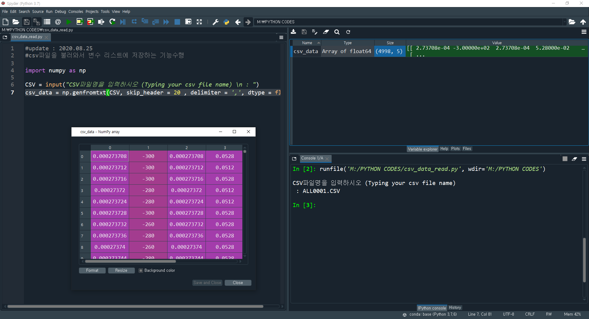 저번 포스팅에서는 MATLAB에서 csv 파일을 가져오는 방법에 대해서 포스팅했었다. 같은 기능을 무료 소프트웨어인 파이썬(Python)에서 구현해보려고 한다. 컴공과도 아닌데 굳이 처음부터 개발할 이유는 없다. 나는 그냥 남들이 이미 만들어놓은거 구글링으로 잘 찾아서 원하는 기능을 구현하는게 목표다. 파이썬에서 매트랩처럼 데이터를 불러오려면 "numpy" 라는 라이브러리가 필요하다. 매트랩은 기본적으로 행렬기반이라 필요없지만 파이썬은 아니기 때문에 numpy를 설치해서 (아나콘다를 설치하면 기본으로 들어있다) 데이터를 입출력해야 한다. (다른 고수들은 이런 방법 안쓰고도 잘 하겠지만.. 나는 허접이기에 MATLAB으로 코드짜고 그걸 파이썬으로 번역을 해서 사용한다)