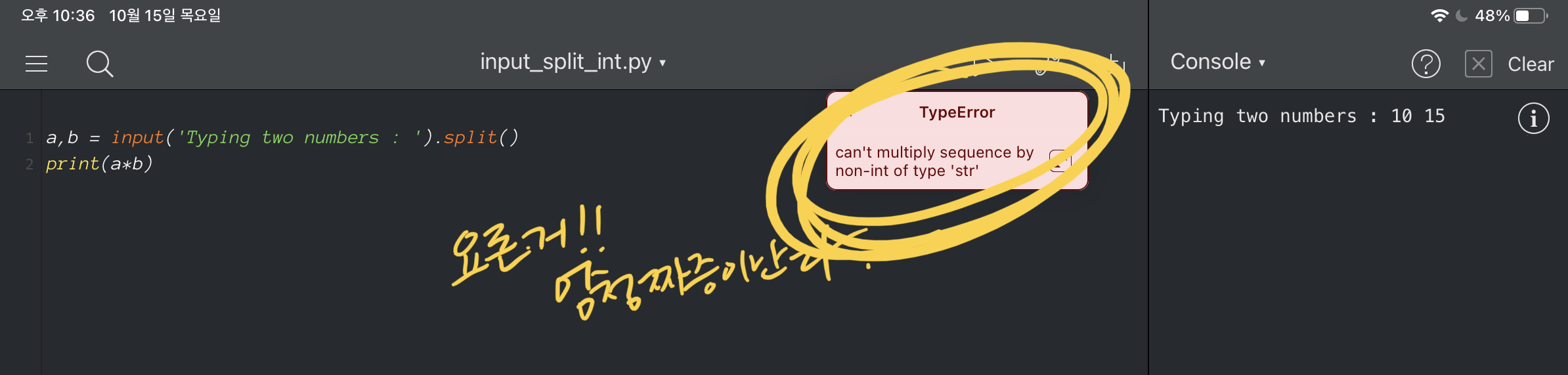 그래서 난 숫자를 입력했지만 컴퓨터가 문자열(str)으로 받아들여서 내가 시킨 연산을 못하겠다고 들어누운거다.