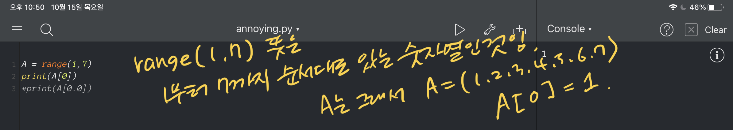 range 함수를 써서 A = (1,2,3,4,5,6,7) 이라는 배열을 만들었다.