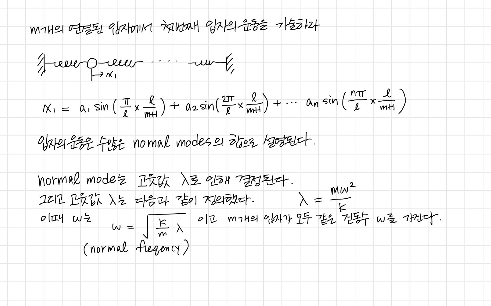 이를 확장해보면, 입자들이 같은 진동수를 가지고 진동하는 normal 모드는 길이가 l인 줄의 standing wave의 모드들과 유사한 특성을 지니는 것을 알 수 있다.