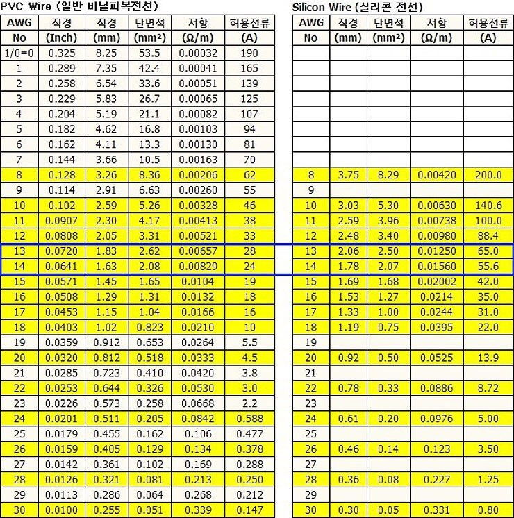 AWG 10 을 기준으로 실리콘 전선이 PVA보다 3배이상의 전류를 흘릴 수 있게 된다.