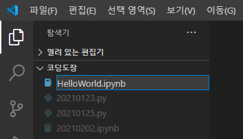 3. VSCODE에서 Jupyter Notebook을 실행하려면 파일명에 .ipynb을 붙여야한다.