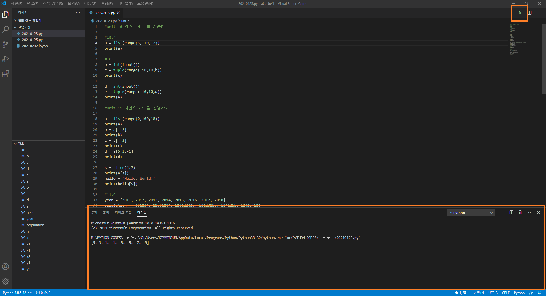 코드를 실행하는 방법도 ▶ 이렇게 생긴 실행버튼을 누르면 실행된다. (정확히는 작성한 코드를 인터프리터가 해석하고 그 다음 실행되는 것이지만)