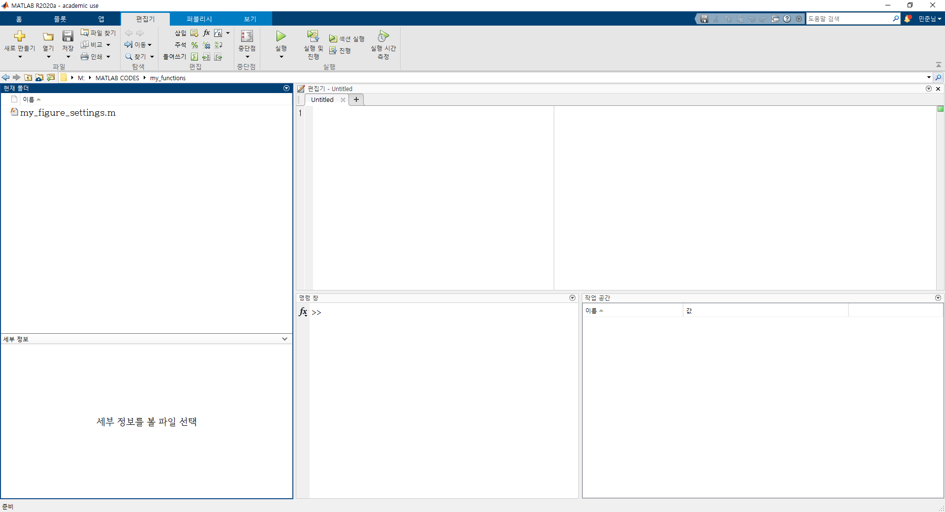 매트랩 편집기에서 코드를 작성하면 자동으로 매트랩 코드파일(.m)이 생기고 Spyder 편집기에서 코드를 작성하면 자동으로 파이썬 코드파일(.py)가 생긴다.