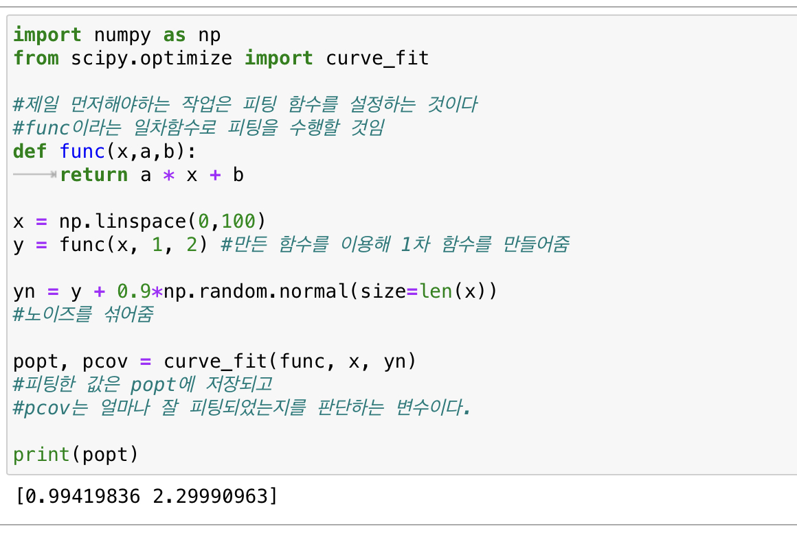 1. def func(x, a, b) : 피팅을 하면 데이터들을 1차 함수나 아니면 다항함수로 근사를 하는데 이때 근사를 위한 모델이 이 함수 입니다. 간단하게 보기위해서 1차함수로 해주고 기울기 parameter로 a, y절편으로 b 2개의 파라매터가 필요하다.