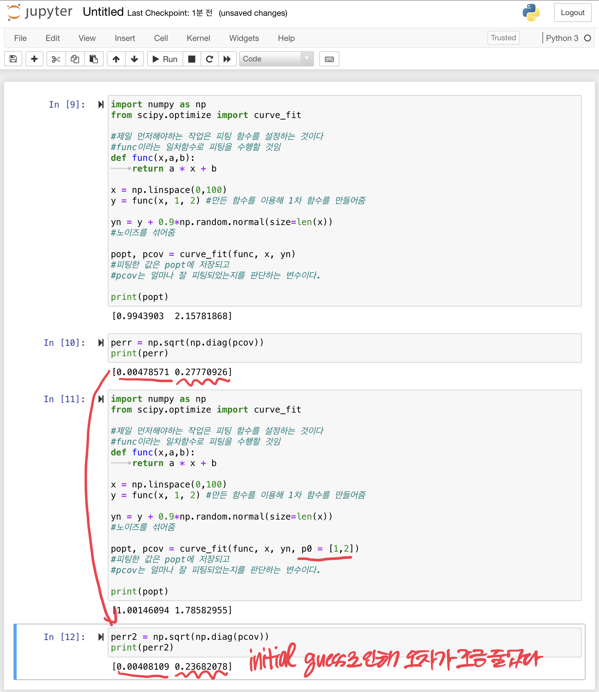 popt , pcov = curve_fit(func, x, yn, po = [1.1, 1.9]) 이런식으로 초기값 (initial guess)를 넣어주면 좀더 정확한 피팅값이 나올 수 있다. 복잡한 함수일 수록 initial guesses가 있고 없고의 차이가 있다고 한다.