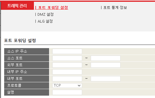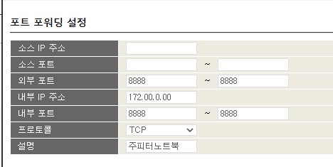적어야 하는거 : 외부포트, 내부 IP 주소, 내부포트, 설명
